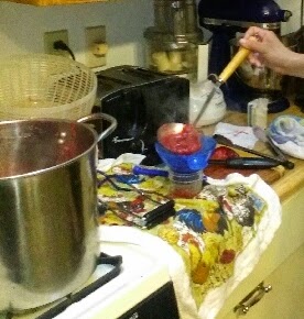 We then added the sugar and peptin and started cooking the mixture a pot. Meanwhile our jars were boiling in hot water and our lids were staying warm. After the mixture was thick enough we got it to a rolling boil and then we started pouring.