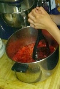When we got to her place, we started cutting and coring the strawberries. I think we cut about 12 cups full and that was enough to make about 15 jars of jelly. Mine were smaller so they did fill up a little quicker. My co-worker brought all the essentials to make the jelly including the sugar (which wasn’t a lot), pectin, some butter, utensils, pots, accessories, and everything else. All we had to bring was the jars. After the cutting we started mashing but didn’t mash it too much because we still wanted some strawberry chunks in there.