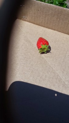 This was my biggest strawberry and I was lucky I even found it because it was hidden inside one of the little shrubs. After I found that one, I started checking the insides of the shrubs and I found a few more similar to this just not as big.