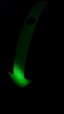It was too difficult to take a picture of it when the lights were off with my phone, so we shined an ultraviolet light on the arrow so you can kind of see it. It really does glow when the lights are off though: